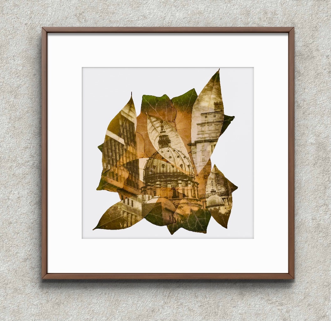 The city breathes across a skin of leaves, whispering that everything—even what we imagine to be immortal—fades with time. Domes and facades, once rigid and unyielding, soften when held by such a delicate, organic surface, offering a quiet meditation on impermanence.
