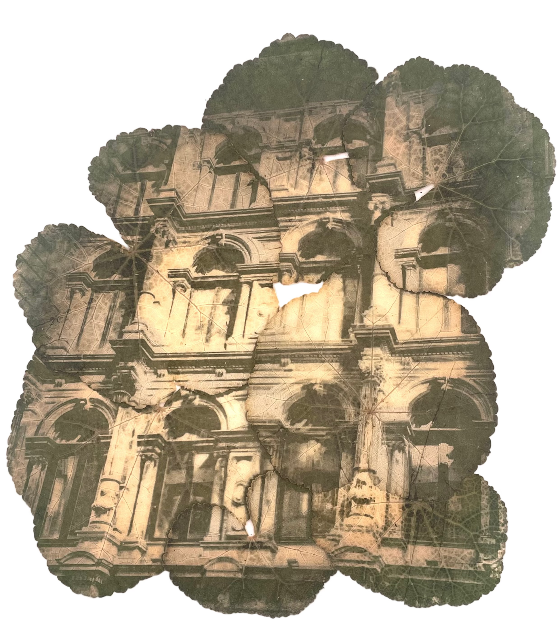 The city breathes across a skin of leaves, whispering that everything—even what we imagine to be immortal—fades with time. Domes and facades, once rigid and unyielding, soften when held by such a delicate, organic surface, offering a quiet meditation on impermanence.